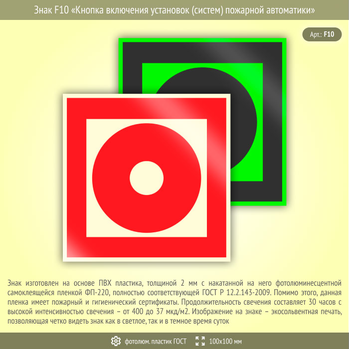 Знак F10 «Кнопка включения установок (систем) пожарной автоматики» (фотолюминесцентный пластик ГОСТ 34428-2018, 100х100 мм) в Ставрополе купить