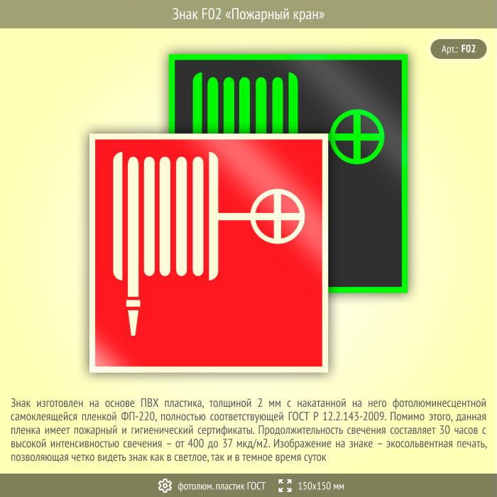 Знак F02 «Пожарный кран» (фотолюминесцентный пластик ГОСТ 34428-2018, 150х150 мм) в Ставрополе купить
