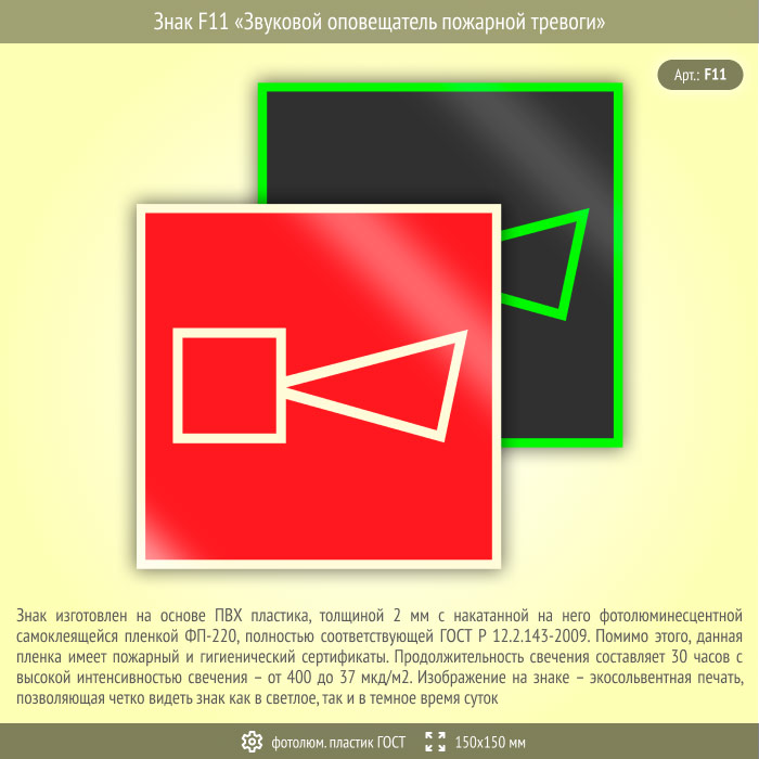 Знак F11 «Звуковой оповещатель пожарной тревоги» (фотолюминесцентный пластик ГОСТ 34428-2018, 150х150 мм) в Ставрополе купить