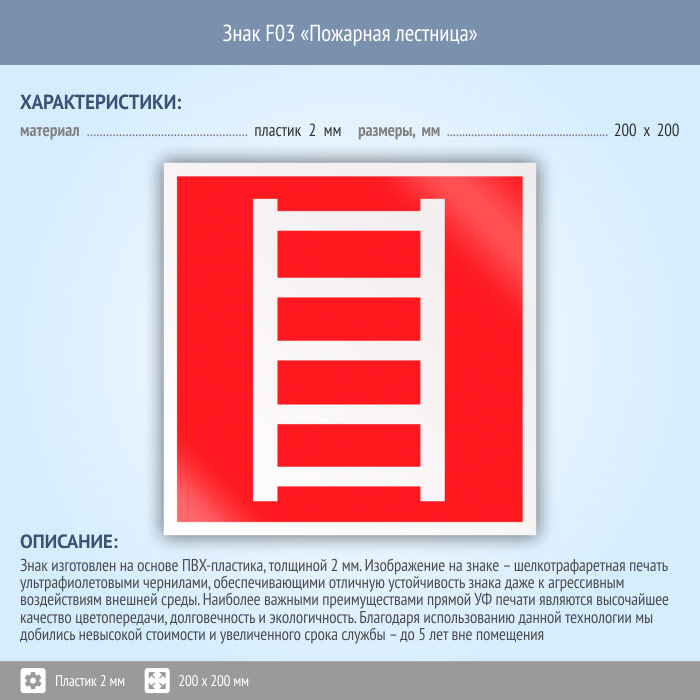 Знак F03 «Пожарная лестница» (пластик, 200х200 мм) в Ставрополе купить