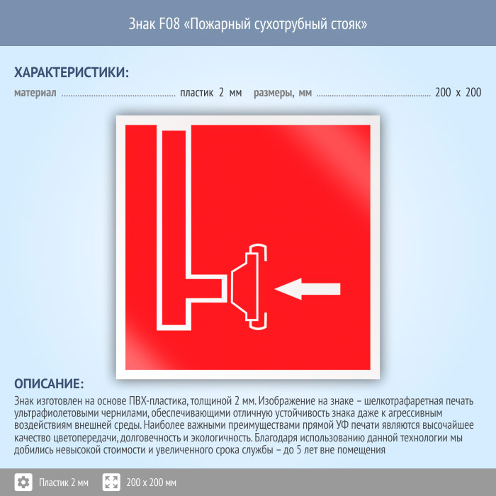 Знак F08 «Пожарный сухотрубный стояк» (пластик, 200х200 мм) в Ставрополе купить