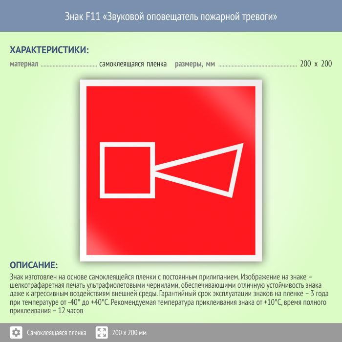 Знак F11 «Звуковой оповещатель пожарной тревоги» (пленка, 200х200 мм) в Ставрополе купить