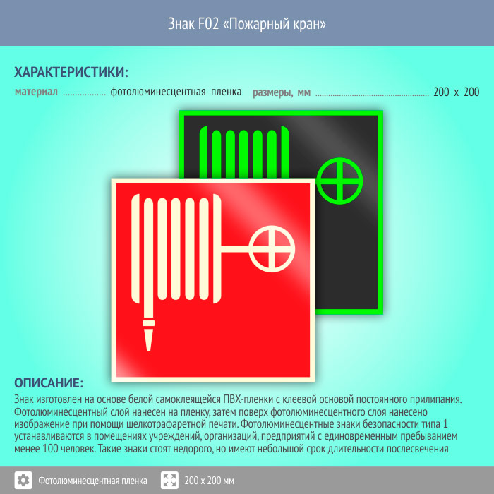 Знак F02 «Пожарный кран» (фотолюминесцентная пленка, 200х200 мм) в Ставрополе купить