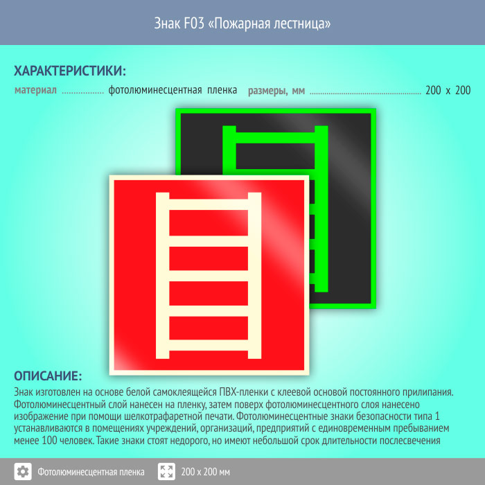 Знак F03 «Пожарная лестница» (фотолюминесцентная пленка, 200х200 мм) в Ставрополе купить