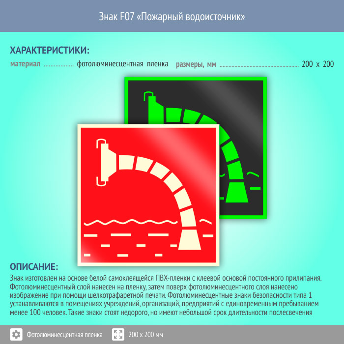 Знак F07 «Пожарный водоисточник» (фотолюминесцентная пленка, 200х200 мм) в Ставрополе купить