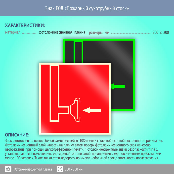 Знак F08 «Пожарный сухотрубный стояк» (фотолюминесцентная пленка, 200х200 мм) в Ставрополе купить