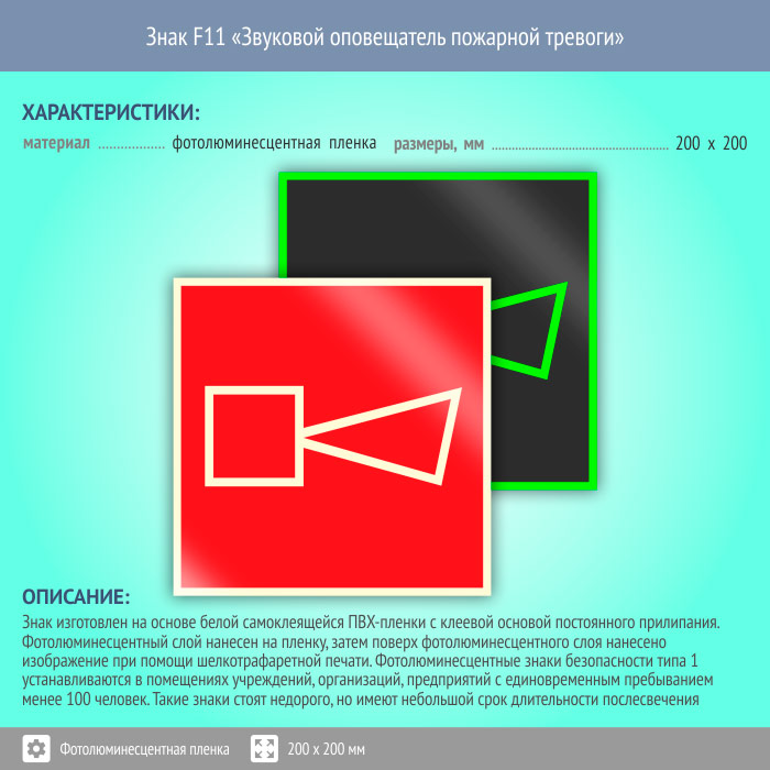 Знак F11 «Звуковой оповещатель пожарной тревоги» (фотолюминесцентная пленка, 200х200 мм) в Ставрополе купить