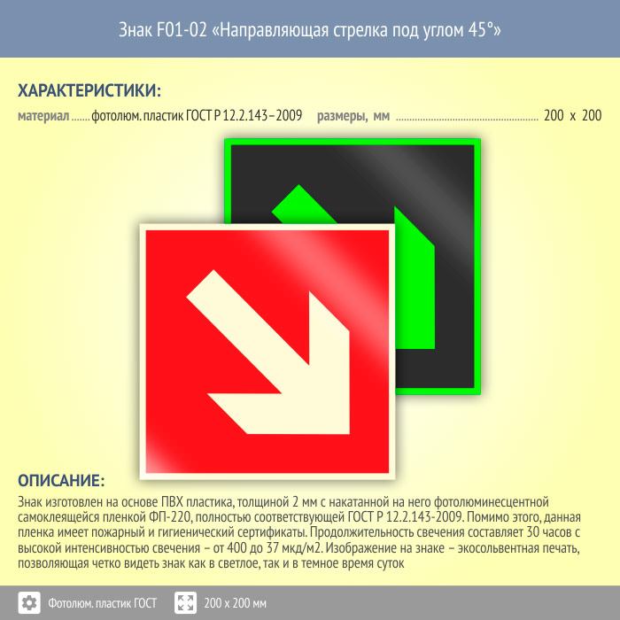 Знак F01-02 «Направляющая стрелка под углом 45°» (фотолюминесцентный пластик ГОСТ 34428-2018, 200х200 мм) в Ставрополе купить