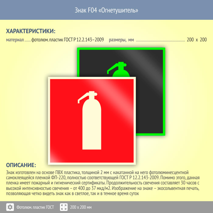 Знак F04 «Огнетушитель» (фотолюминесцентный пластик ГОСТ 34428-2018, 200х200 мм) в Ставрополе купить
