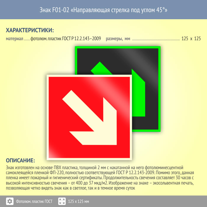 Знак F01-02 «Направляющая стрелка под углом 45°» (фотолюминесцентный пластик ГОСТ 34428-2018, 125х125 мм) в Ставрополе купить