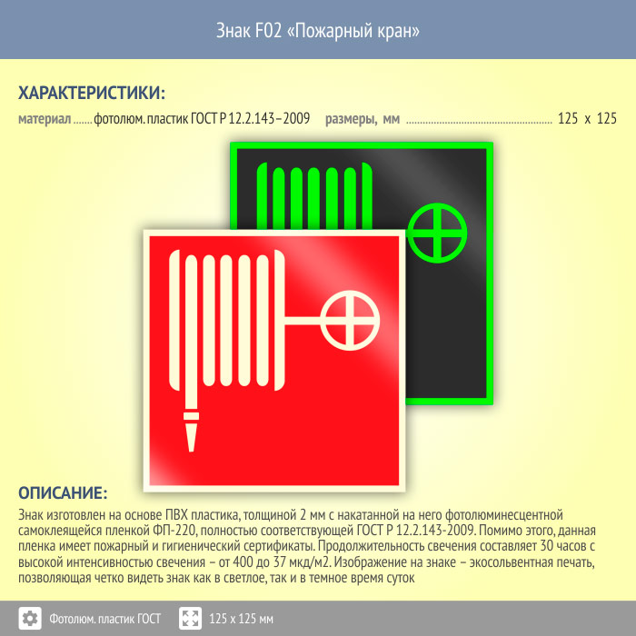 Знак F02 «Пожарный кран» (фотолюминесцентный пластик ГОСТ 34428-2018, 125х125 мм) в Ставрополе купить
