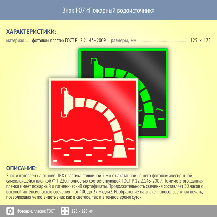 Знак F07 «Пожарный водоисточник» (фотолюминесцентный пластик ГОСТ 34428-2018, 125х125 мм) в Ставрополе купить