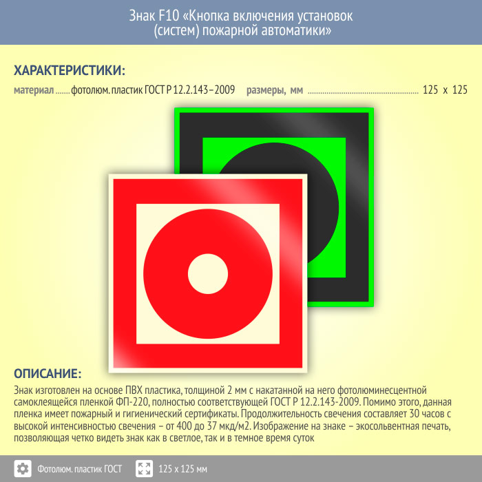 Знак F10 «Кнопка включения установок (систем) пожарной автоматики» (фотолюминесцентный пластик ГОСТ 34428-2018, 125х125 мм) в Ставрополе купить